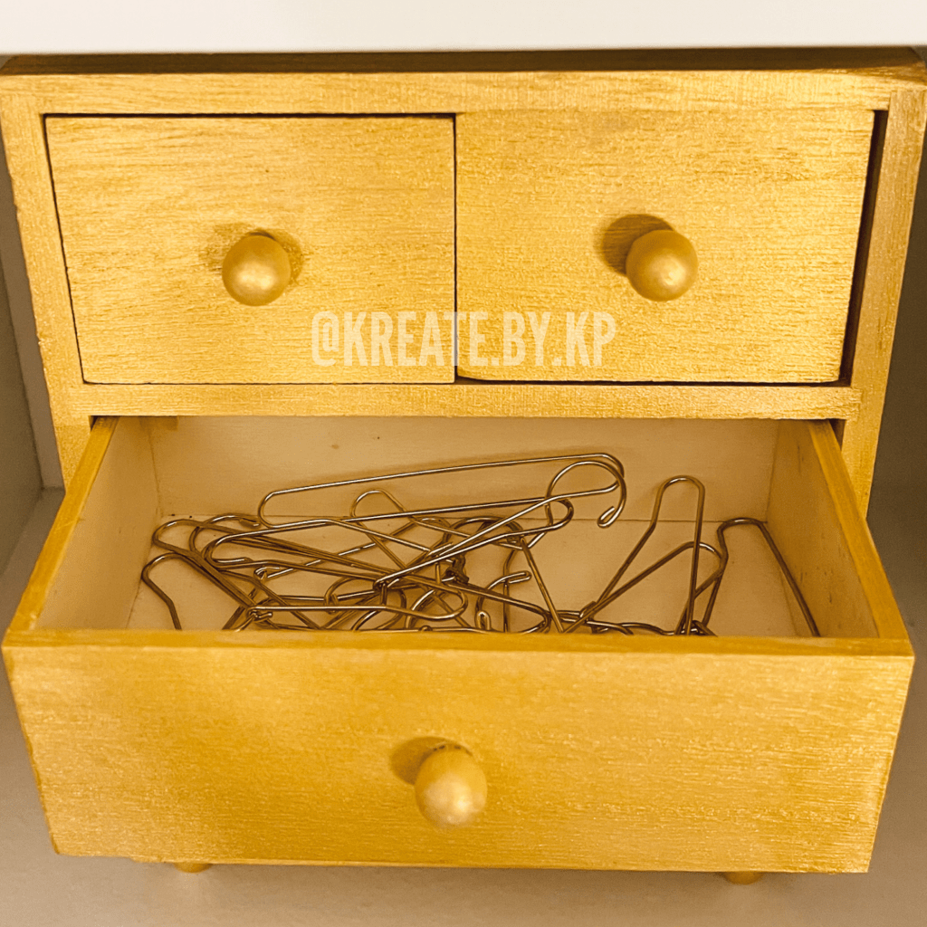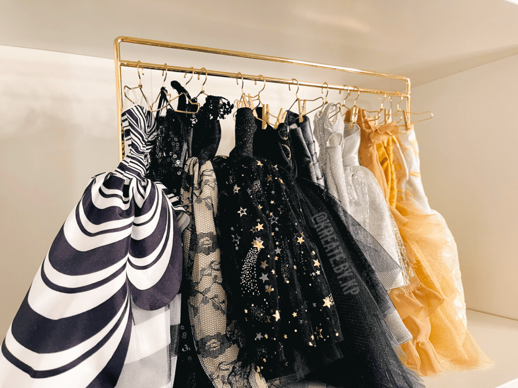 The second shelf holds a miniature wooden dresser that I purchased from Michaels. It is painted gold to match the color scheme of the closet as well and currently holds all of the extra hangers and miniature clothespins for the clothing rack when not in use.