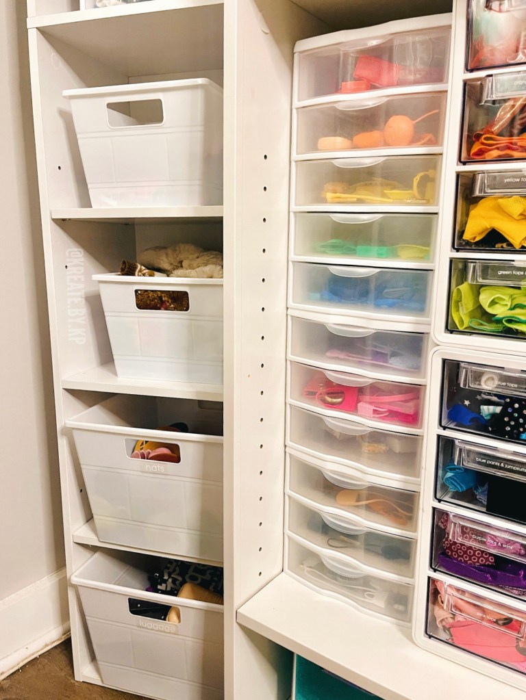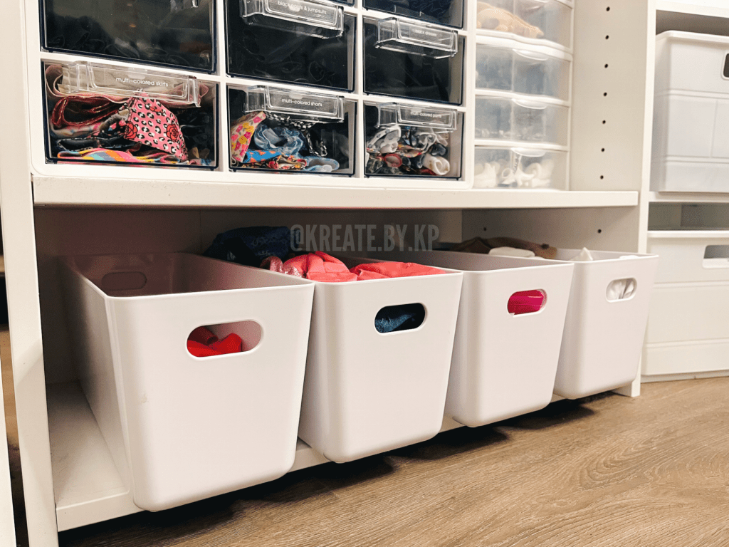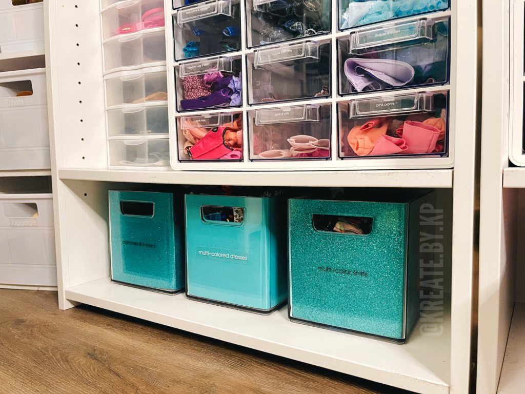 The bottom four shelves hold another two small and two medium plastic storage bins for the remaining clothes, shoes, and accessories.