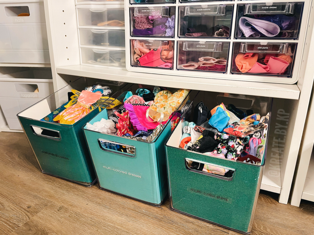 The third shelf holds all of my Ken doll shirts. I used this set of ombré photo cases that I purchased from Michaels to categorize the shirts by type, color, and style.