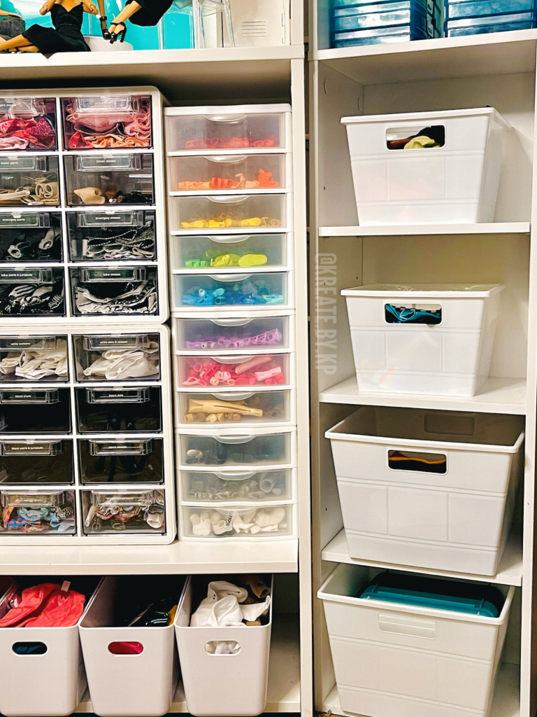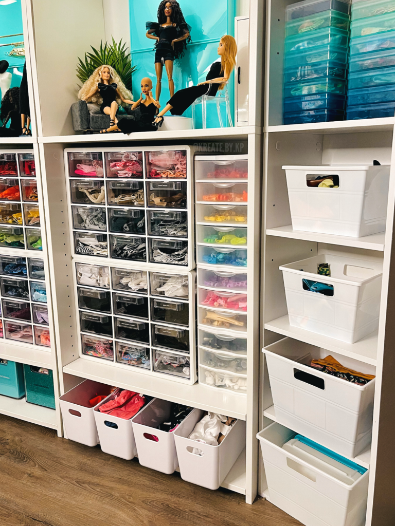 The fourth shelf contains two more of the small Sterilite drawers that I used on the bookshelves. These drawers hold all of the contents of the Barbie x PUMA collection from 2018-2019.