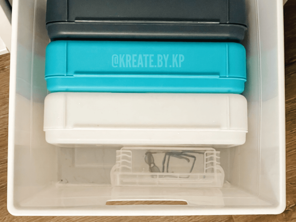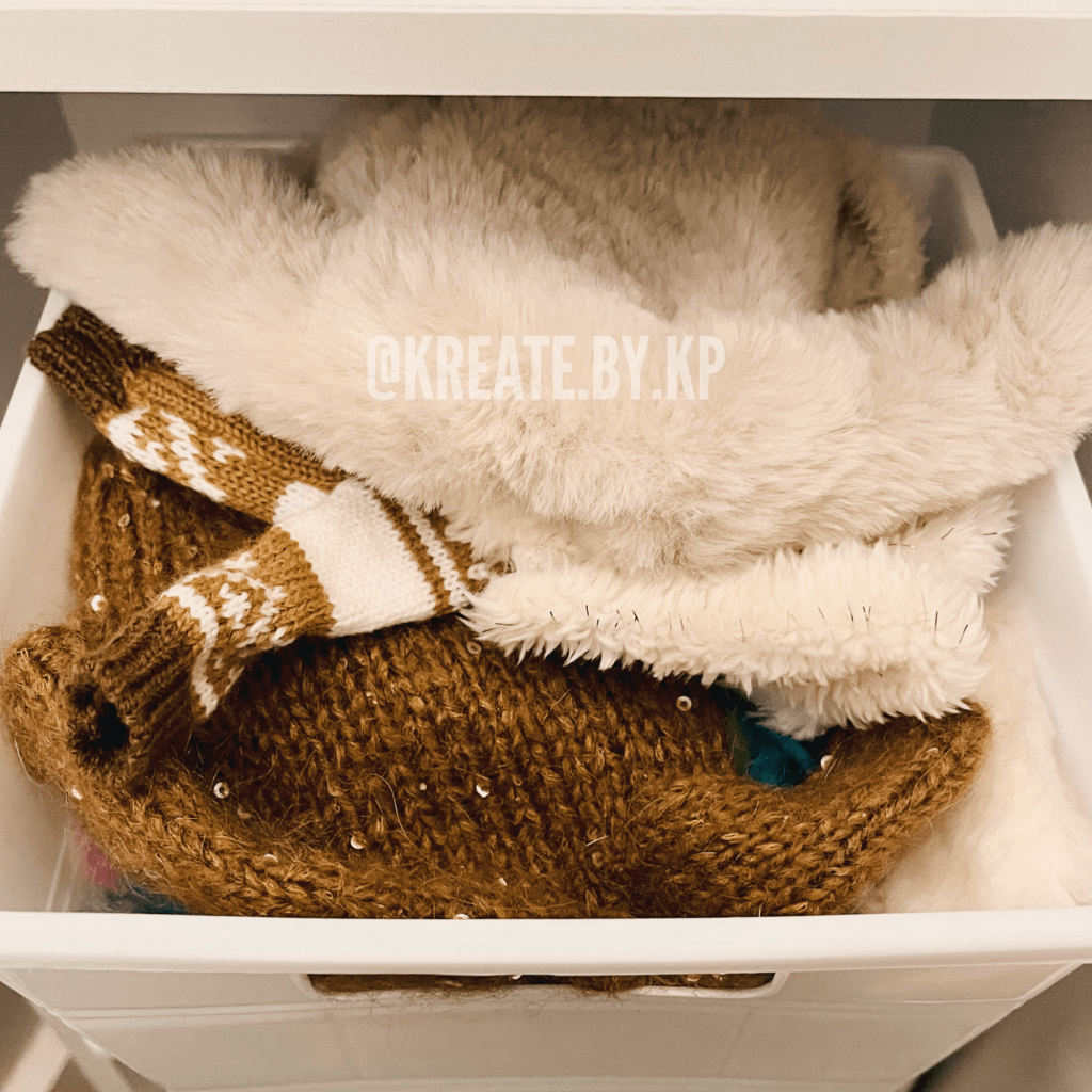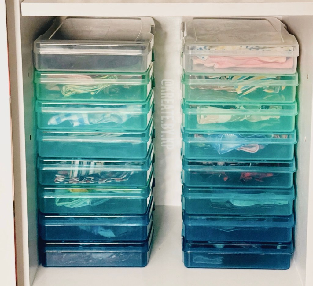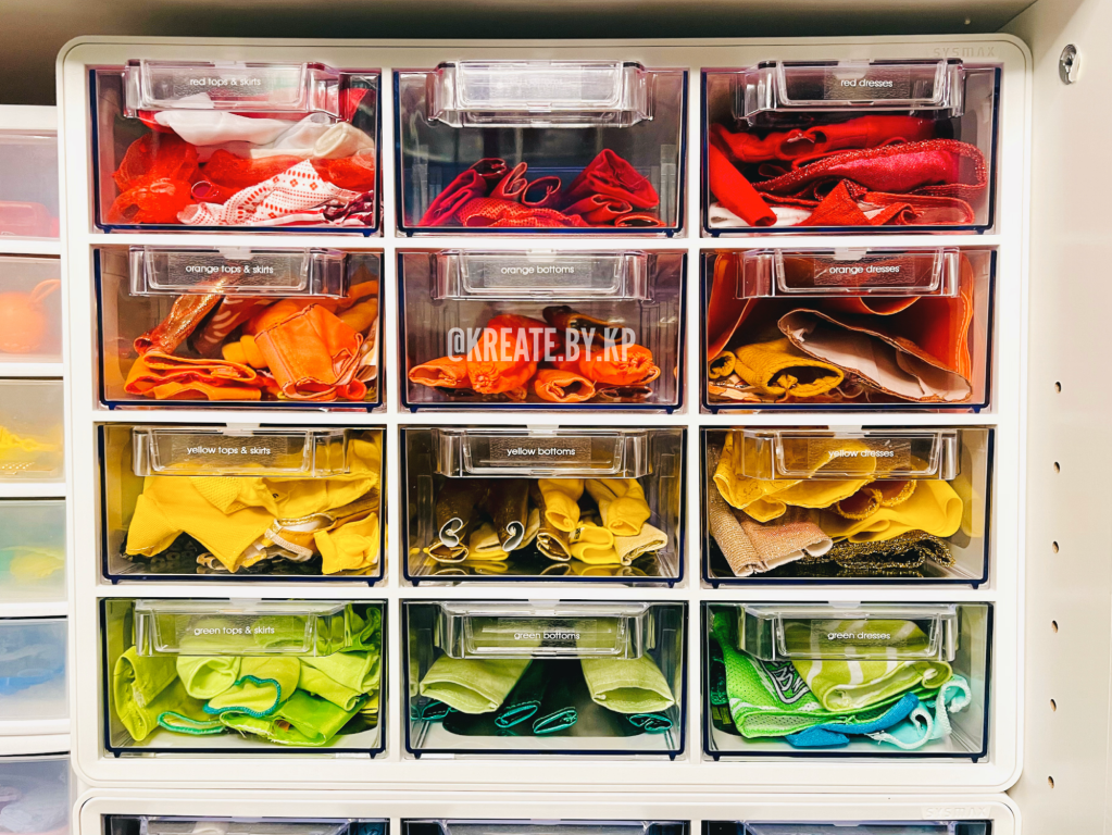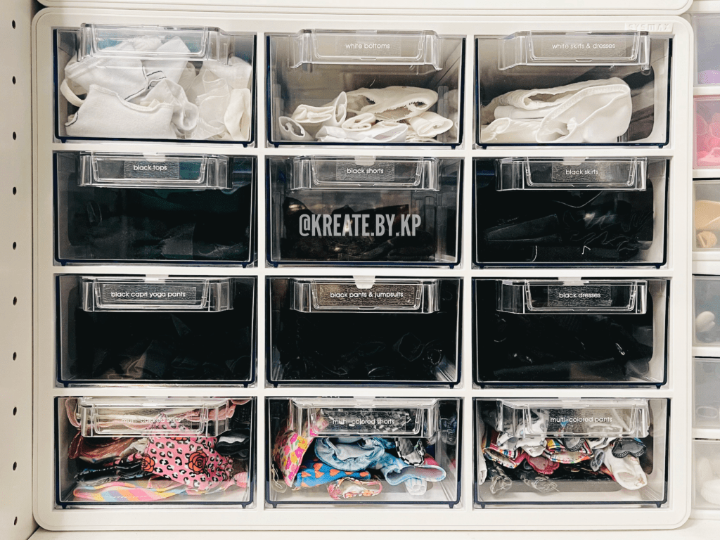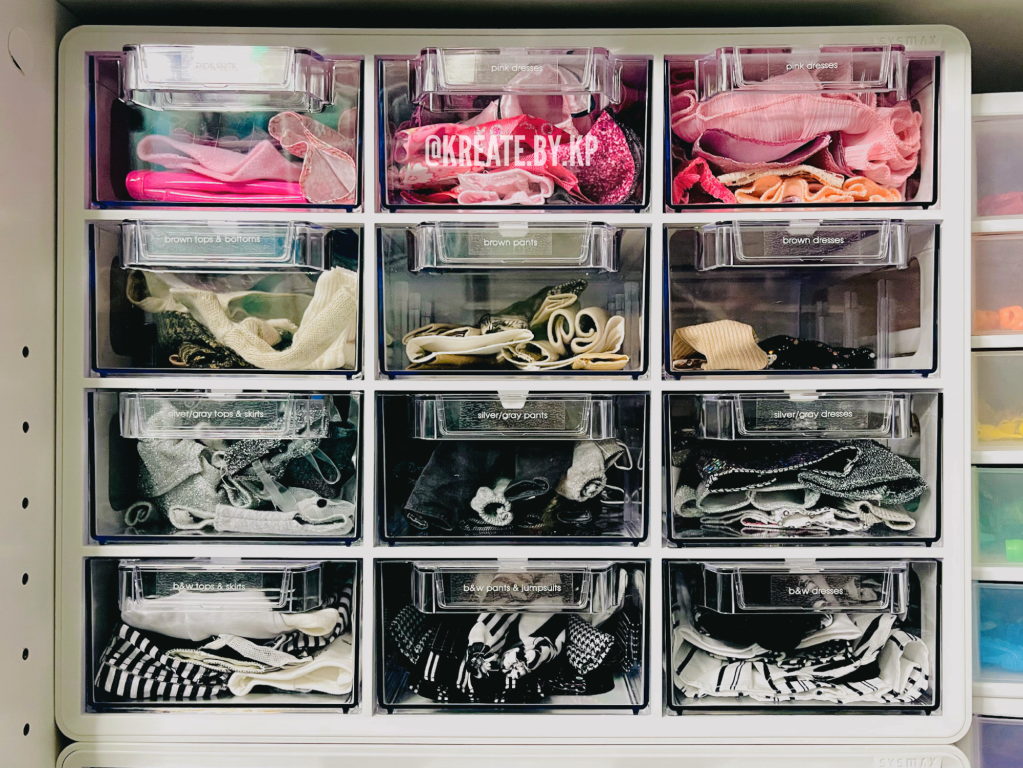 I organized all of the clothes by type and color in four more of the SYSMAX units in white that I found at my local TJ Maxx and Marshalls stores. I discovered that this method was the easiest way for me to pull and return clothes that I use for photoshoots rather than my previous method of using binders and sheet protectors.
