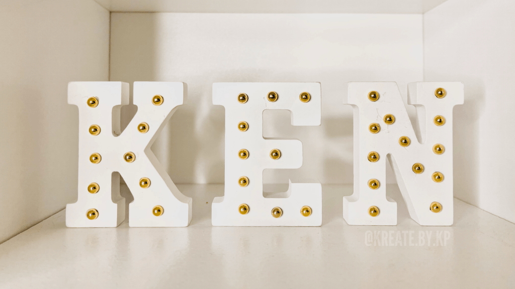 The second shelf features some white wooden letters that I hot glued some gold gems on to create a marquee-style detail.